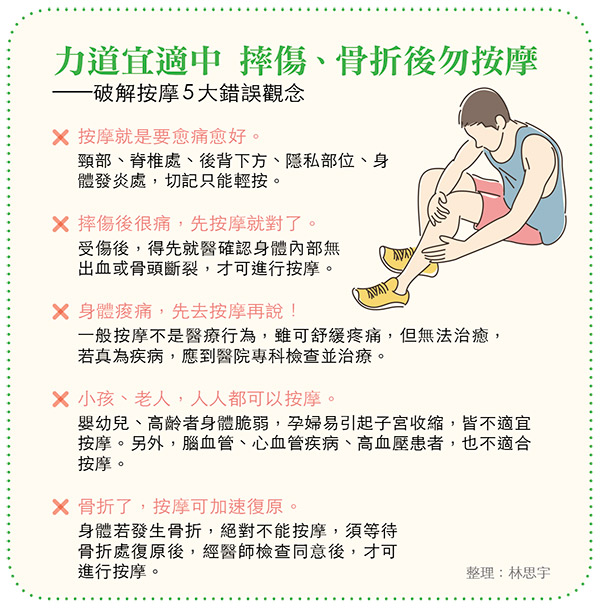 但簡文仁強調,上述部位不是不能按,若以輕輕地搓揉方式,可讓患部疼痛不適感獲得緩解。他進一步舉例,如足底筋膜炎患者,就不適合力道過重的腳底按摩,否則發炎處易惡化;但若只是輕輕搓揉,可舒緩疼痛。不過,他也強調,骨折處不能按摩。