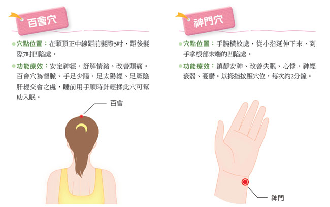 ● 功能療效:鎮靜安神、改善失眠、心悸、神經衰弱、憂鬱。以拇指按壓穴位,每次約2分鐘。