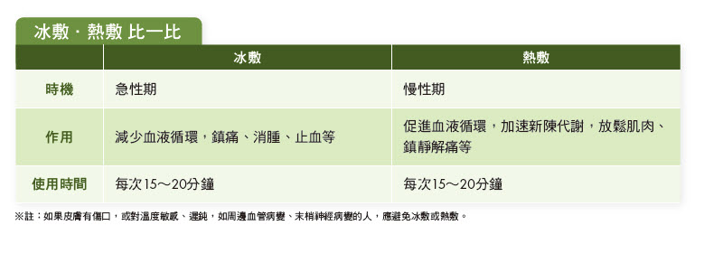 萬芳醫院復健科主任張光華說:「我們不妨先將疼痛分為0~10分,假設自己一直有痠痛的小毛病約4分,這時想讓痠痛得到緩解就可以利用熱敷;可是有一天做了某個動作或受到撞擊,這疼痛突然加劇變成7分,那麼就要改為冰敷,因為從4分上升到7分代表著急性受傷。」