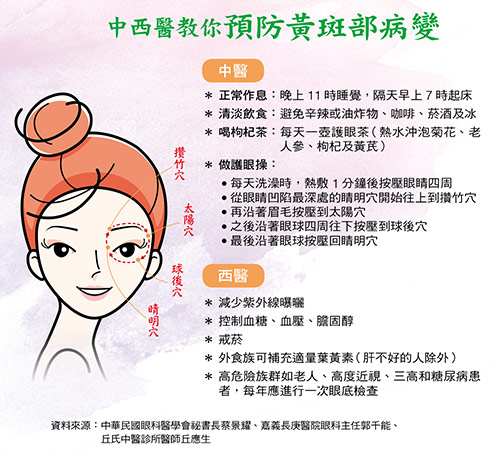 雖然預防勝於治療,但蔡景耀也坦言,要預防黃斑部病變還真難,得從減少危險因子著手,如減少紫外線曝曬、控制三高等慢性病,也提醒高危險群記得每年一次眼底檢查,早發現早治療。至於柯總召求助的中醫針灸,發明「眼針療法」的丘氏中醫診所主治醫師丘應生表示,眼針是從外部肌肉針入,繞過眼球刺激睛明穴和球後穴為主,攢竹穴和太陽穴為輔,一次療程約十五分鐘,至少三個月見效,次數和效果依病情不同而異。