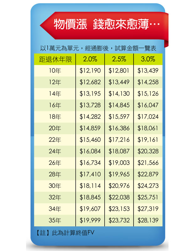 舉例︰距離退休還有30年,通膨率是 2.5%,預計退休後每月開銷相當於現在的2 萬元,30年後是多少錢?經查表得知,以1 萬元為計算單位,在通膨率2.5%下,30年 後的金額是20,976元,若希望每月開銷維持 於現在2萬元,那麼30年後金額是41,952元 (20,976×2)。