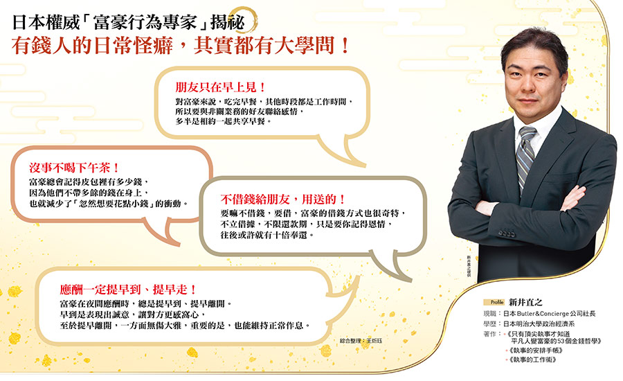 「到現在,我每個月都會收到『前老闆們』的關心或小禮物。」新井說,富豪們的另一共通點,是「重視人際關係」。