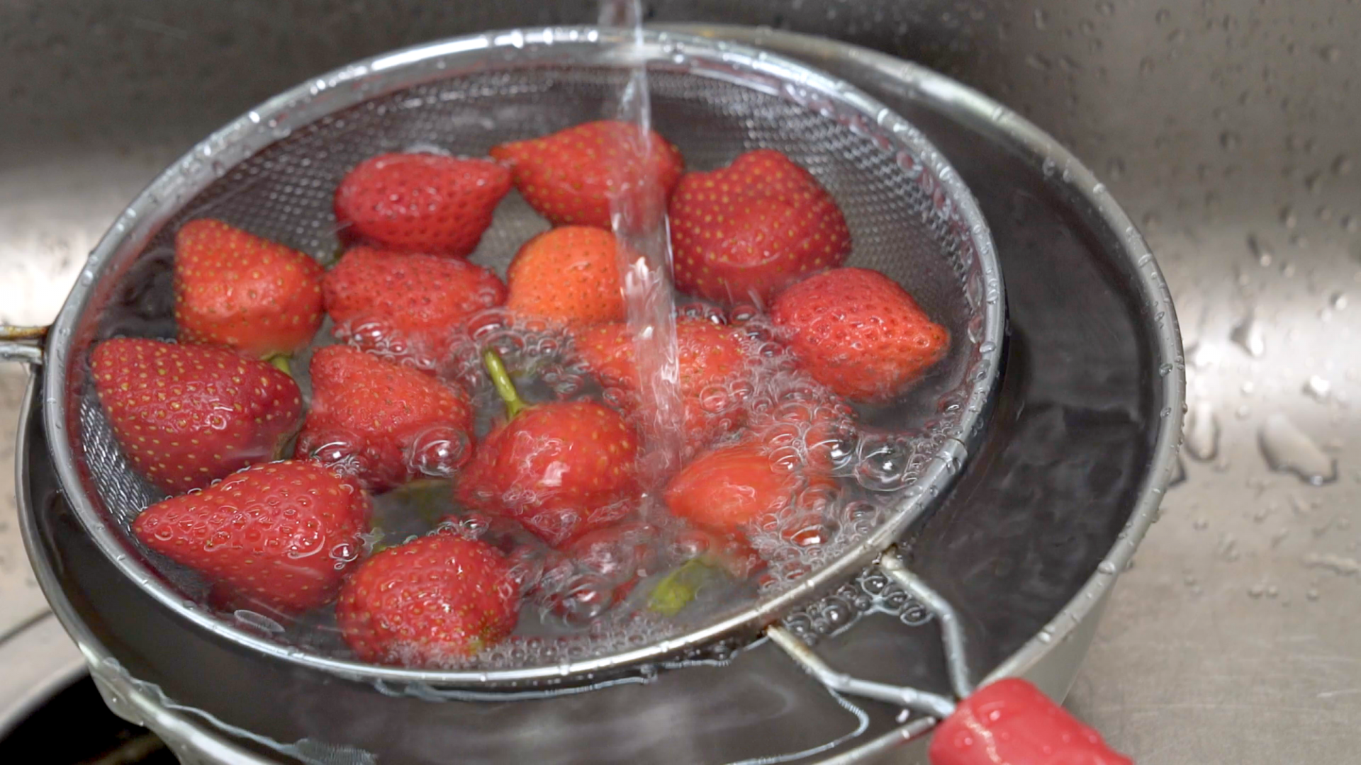 (▲使用漏網與盆子,將草莓放入漏網中清洗一二次。)