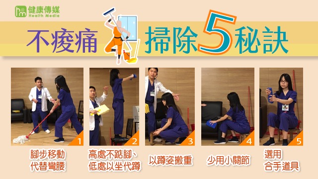 邱正民進一步說明,正確的做法是,掃地、拖地或使用吸塵器時,應多走動,避免彎腰聳肩和駝背姿勢;擦拭高處櫃子時,可使用小凳子墊高,避免踮腳尖及過度抬頭擦拭,低處則以矮凳取代長時間彎腰及蹲的動作,建議操作範圍以胸前至頭部高度,水平則是雙手打開為最大範圍,避免身體過度傾斜延展,造成肌肉拉傷。