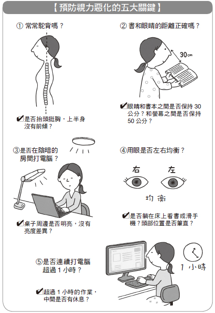 只要能減少會造成視力惡化的原因,就可以減輕眼睛的負擔,因此請檢視以下五點: