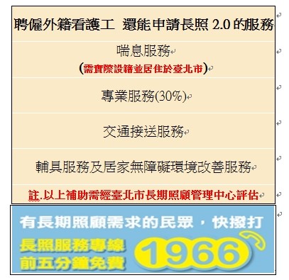 長照2.0對於已聘僱外籍家庭看護工之家庭,經臺北市長期照顧管理中心評估核定後,只要長照需要等級第2級(含)以上者,仍可以申請需要的長照服務。