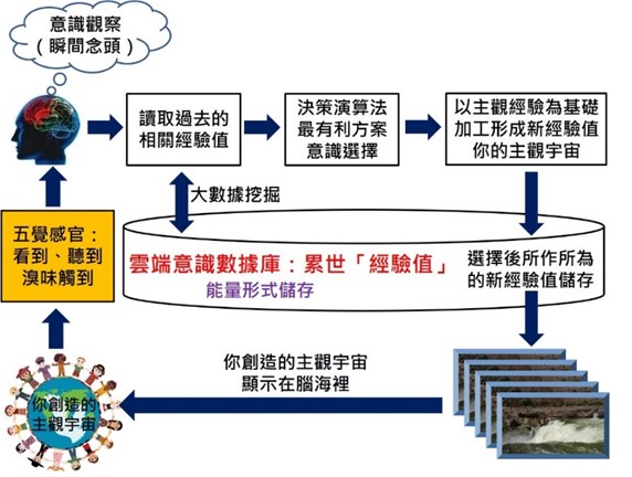 5.將新的經驗值儲存在「雲端意識數據庫」裡,成為「過去的你」的一部分。這些「過去的你」的經驗值就是你的宇宙總集合,也相等於你的另一個意識,在佛教稱為「業」,心理學家稱為「潛意識」。潛意識會控制及指揮大腦的每個行為,所以「現在的你」是沒有自由意志的,是「過去的你」創造「現在的你」,「過去的你」或潛意識或經驗值的慣性,在佛教就稱為「業力」,命運的控制者是精神世界的業力而不是物質世界的你。