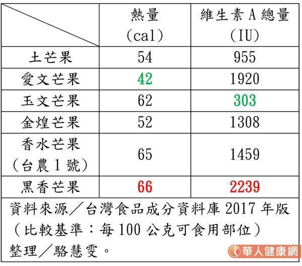 以減重族最擔心的熱量為例,根據食品藥物管理署「台灣食品成分資料庫2017版」資料顯示,在國人常見的6種芒果中,黑香芒果的熱量最高,每100公克可食用部分含熱量66大卡,其次依序為香水芒果(台農1號)65大卡、玉文芒果62大卡、土芒果54大卡、金煌芒果52大卡、愛文芒果42大卡。雖然不同芒果品種間的熱量差異不大,但積少成多,對於需對熱量斤斤計較的減重族來說,仍不失為一個參考。