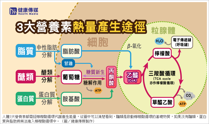 郵政醫院資深營養師黃淑惠表示,這個研究結果並不令人意外。她解釋,飲食中主要有3種營養素供身體產生熱量,分別為醣類、蛋白質、脂肪,而這3種營養素都要經過檸檬酸循環(TCA cycle)代謝、分解才能產生身體所需的能量。