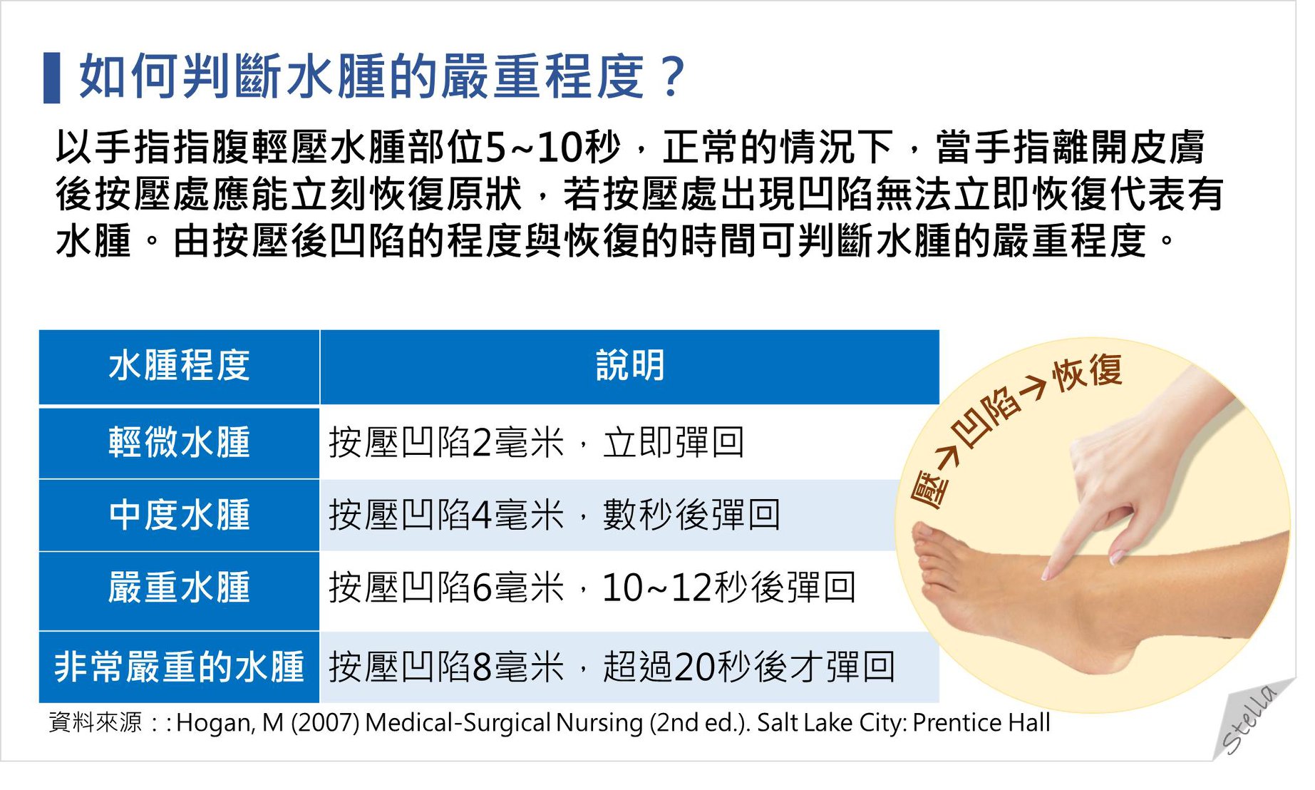 所以當出現水腫時,可初步先過濾是否為疾病所引起還是只是不需緊張的生理現象,若為疾病引起,則宜進一步就醫找出水腫原因以期能對症處理。