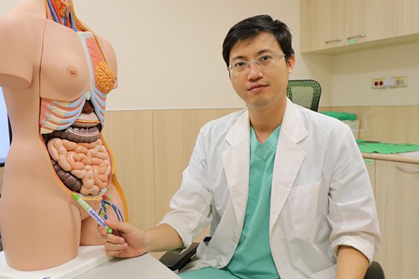 ▲ 亞大醫院一般外科主治醫師羅文鍵指出患者疝氣發生處。(圖/亞洲大學附屬醫院提供)