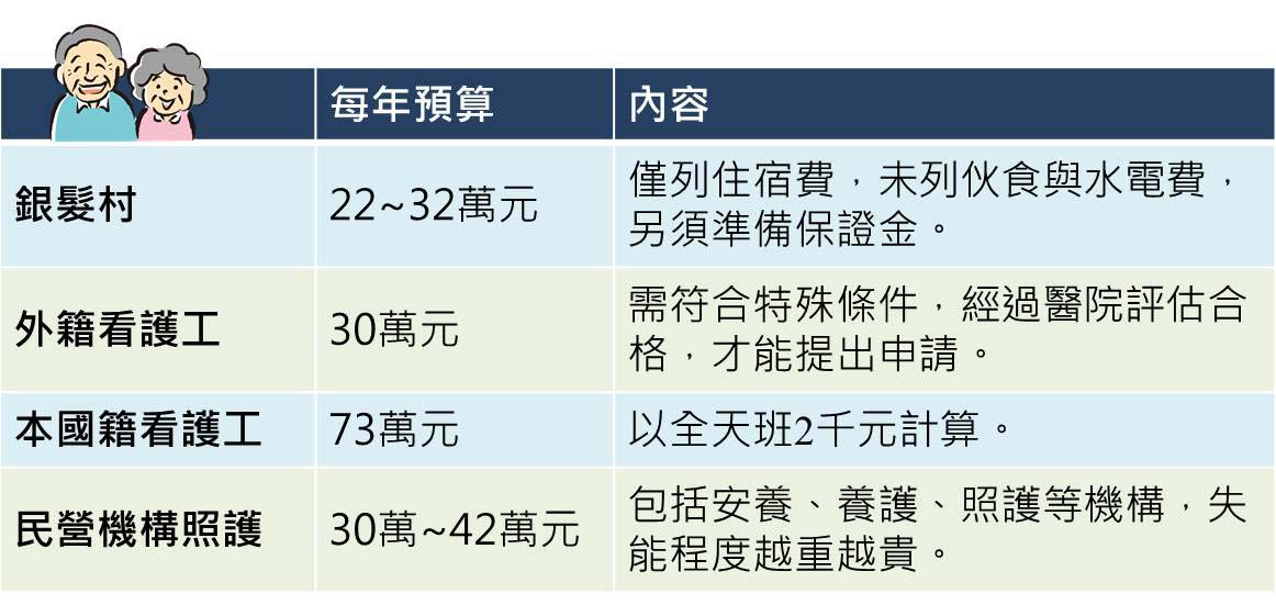 最便宜的照護方式是外籍看護工,我概抓一年30萬元(含調漲後的薪資、加班費、健保費、仲介服務費、體檢費、就業安定費、伙食費)。以聘僱期10年計,至少要準備300萬元的外籍看護預算,這個估算尚未納入通膨與調薪。