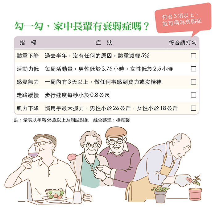 「衰弱症是整體功能性衰退的重要指標。」長庚紀念醫院內科部一般內科暨高齡醫學科主任陳英仁進一步說明,當出現體重下降、活動力低、感覺無力、走路緩慢、肌力下降,這五項指標只要符合三項以上,就可以稱為衰弱症,前兩項則是前期徵兆。詹鼎正提醒,此測量對象為六十五歲以上的長者,目前醫界並不認為中年人適用於衰弱症的指標。