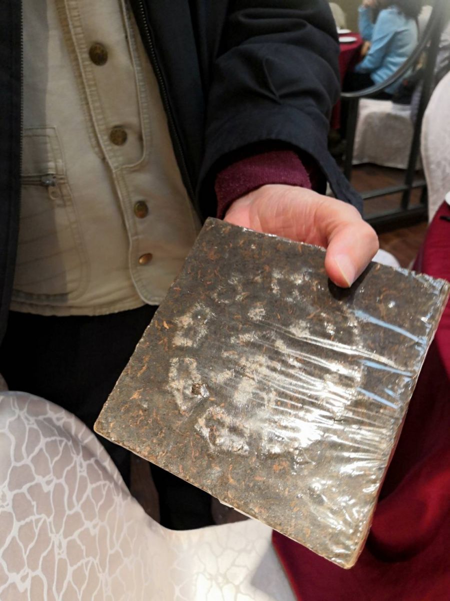 至於另外一片茶,還真的是有趣了。這是早年中茶公司製作的老東西,它是四片茶磚做成一個大的單位,叫做「福、祿、壽、喜」。 我的老長官手上擁有的上頭是個「壽」字,和他今年90大壽,恰好能夠相得益彰,是真正的好東西!