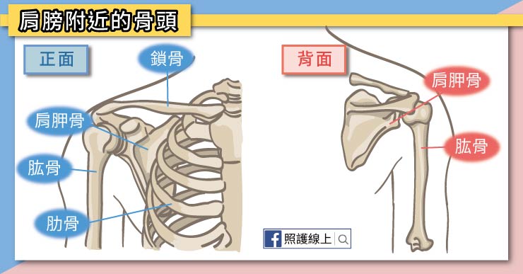 要講肩膀的的運動前,我們看一下肩膀附近的骨頭,包含肱骨、鎖骨、肩胛骨、肋骨、和胸椎。要記得鎖骨位在我們的正面,肩胛骨在背部。