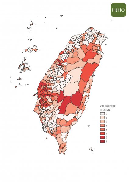 衛福部國家C型肝炎旗艦計畫辦公室研究員吳慧敏表示,C型肝炎的病患分佈極具地區性,根據目前統計,台灣的C肝風險潛勢區域前十名為:
