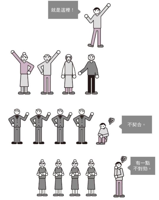 請試著回想你小學、中學、高中的班級,當班上有多達三十名的同學時,自然就會形成一個個的小團體,不需要由誰來決定。而且不可思議的是會自然分為調皮型、風雲人物型型、運動型、藝文型的小團體,有的讓你待起來舒服,有的則格格不入。