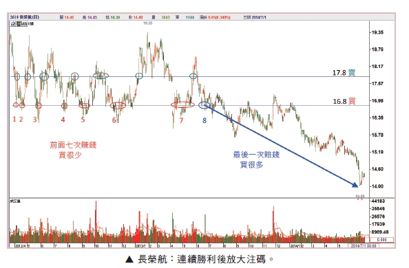 故事的後半段是這樣,經過連續操作獲利帶來的信心,讓他對投資股票充滿希望和樂觀,同時他也覺得以前太保守買太少,於是下次長榮航股價再跌到16.8元的時候他買進10張股票,你們知道發生什麼事嗎?