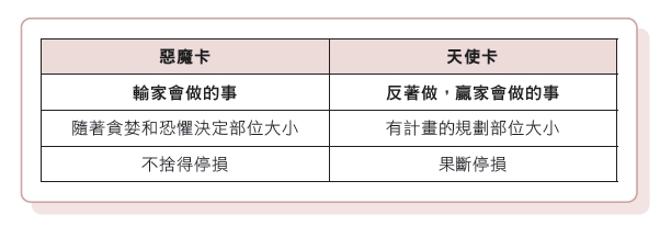 如果你也會因為連續的勝利而忽然放大注碼,或是因為行情奔馳而衝動性放大交易部位,請在【惡魔卡】記下一筆:隨著貪婪和恐懼決定部位大小,在【天使卡】記下:有計畫的規劃部位大小。