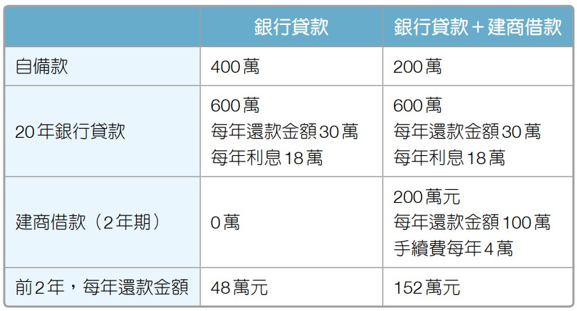 首先這類型的借款期限比較短,也許1到2年不等。以1,000萬的房子來說,一般的銀行貸款可以貸到600萬元,如前所述,假設年利率為3%,第1年即要償還本息共48萬元;再加上建設公司多出來的借款200萬元,1年要償還100萬元,還要加上一期手續費,若以4萬元計算,第1年就需支出152萬元。