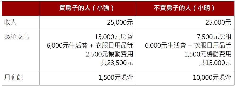 我們來做一個「人生試驗」。假設,小強和小明同年齡,從同一家學校畢業,在同一家公司工作。兩年後,他們月收入都是兩萬五千元,現在他們決定考慮買房子的事情。