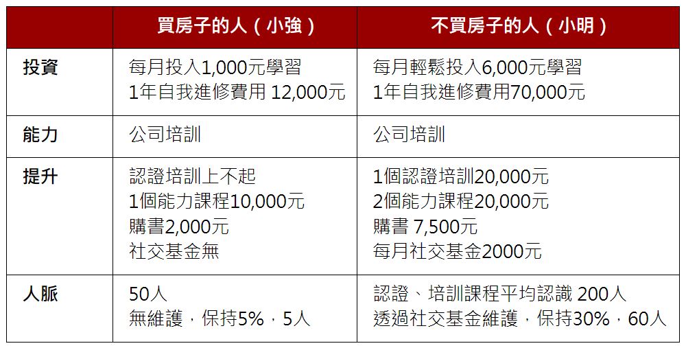 思考的結果,小強決定買房,而小明決定拿錢投資自己。