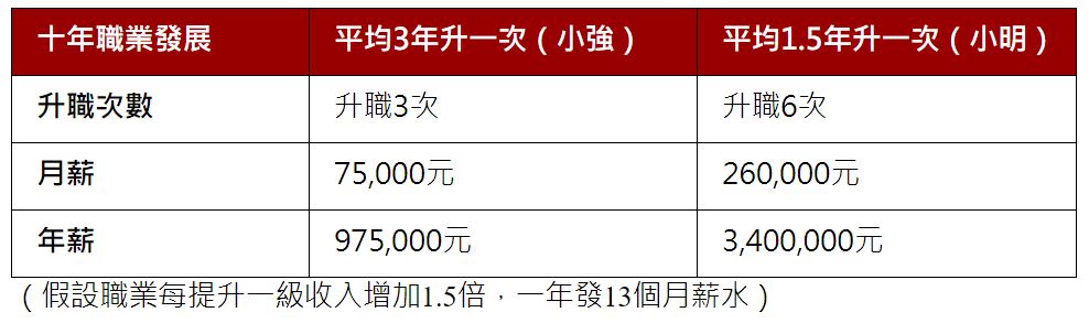 事實證明,小明因為有更多的知識和更好的人脈,升職速度幾乎是小強的兩倍。