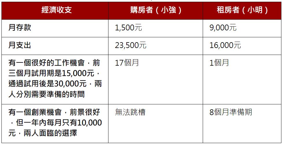 不買房的人,一個月之內就可以跳槽到新行業、新公司,承擔轉換行業與職位的短暫壓力,獲得更好的發展機會;只要準備八個月就可以嘗試創業。而買房者則永遠與這些機會遠離了。