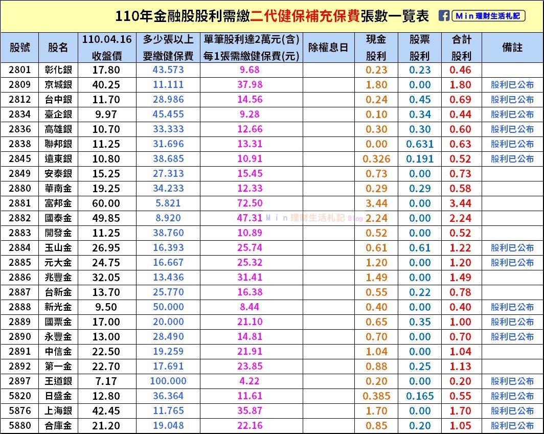 本文由M I N 理財生活札記授權轉載,原文刊於存股 》110年金融股股利需繳二代健保補充保費張數及費用一覽表(更新日110.03.16)