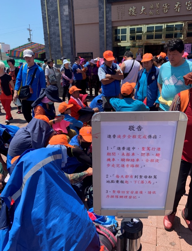 他以自身經驗說明,大甲媽祖遶境較具傳統性,參與人數最多,有不少一日體驗團及觀光客,若撇除觀光客,年長者還是佔相當比例。因為其路線固定,民眾會事先準備好迎駕,隨行香客也不一定跟在神轎旁邊,整體來說聲勢較浩大,沿途陸續可見進香客,綿延可達20公里。