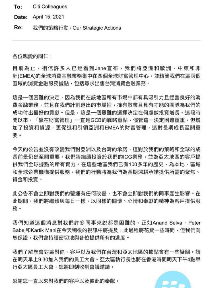 金管會官員也證實,花旗銀行董事長暨台灣區總裁莫兆鴻已先向金管會報告,基於策略考量,花旗集團將處分包括台灣在內的全球多處消金業務,亞洲只會留下新加坡與香港。不過,花旗銀行只是結束消金業務,企金等業務還是會存在。