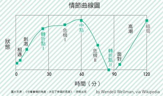這張圖是前面提過的好萊塢編劇溫德.威爾曼提出的情節曲線圖,電影大致都是採用像這樣的三幕劇結構。而現實人生,基本上也是朝著這樣的模式發展: