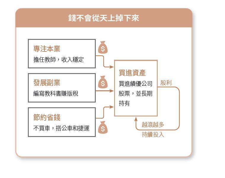 我決定效法雙方長處,首先我要認真工作撫養3 個小孩,利用假日到大學進修以取得教師證,晚上到夜間部兼課賺鐘點費,寒暑假努力寫書賺取版稅,然後拼命存錢並學習「用錢賺錢」的知識,每天花好幾個小時來研究股票。這樣持續了20 幾年,現在終於可以年領500 多萬元股息,也開始改變了我的未來。