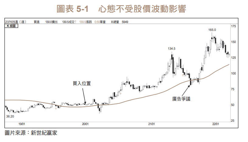 但在 2021 年 5 月, 技嘉因一則廣告字眼引起爭議,進而引發中國大陸的抵制。股價受此利空消息, 從 2021年 5 月 3 日盤中最高的 134.5 元, 陸續跌到 2021 年 8 月20 日最低來到 80.5 元,幾乎讓 2021 年的漲幅回到原點, 自己的報酬率則是從 205%回到 83%,因報酬率還大於 20%,還在自己認定的「不太需要關注的個股」名單中,就持續抱著(見圖表 5-1)。