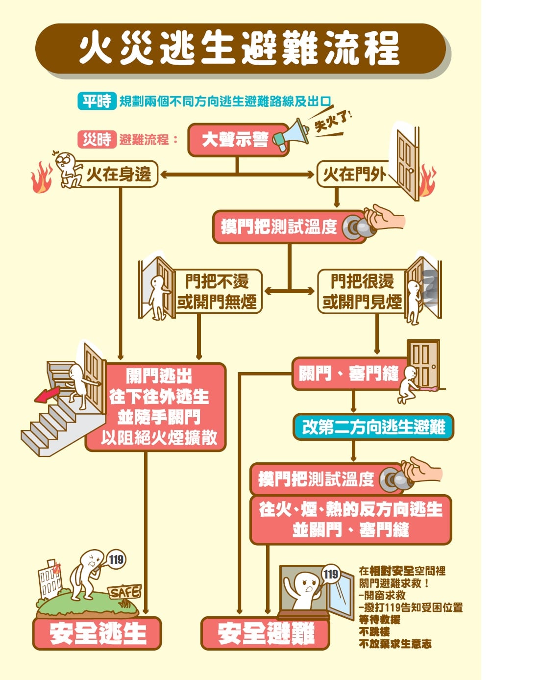 - 大聲示警→嘗試逃生避難→A門外火勢不大,盡快逃出火災現場;B門外濃煙瀰漫,關閉房門塞滿門縫,可延長待救時間。