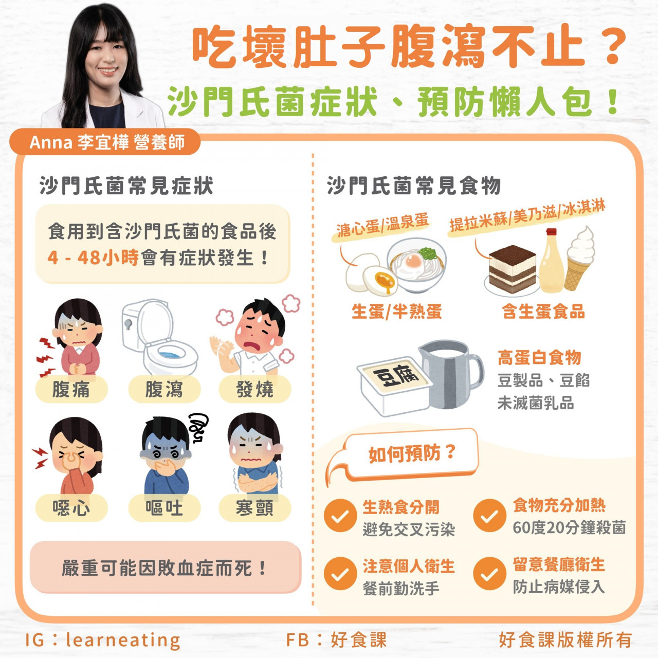 好食課營養師李宜樺指出,吃到受沙門氏菌污染的食物,一般會出現腹瀉、腹痛、發燒(高燒38-40度)、噁心、嘔吐、寒顫等症狀,部分人則可能會有血便問題,持續約2至3天便可痊癒,期間需要注意補充水及電解質。