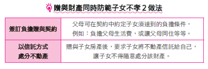 另外,父母也可以善用信託方式,要求子女將受贈的不動產做信託。舉例來說,將房子信託給信託業者管理,例如:出租,將租金收益由父母做為受益人。由於不動產已變成信託財產,子女就不得隨意處分。或是直接辦理預告登記,如此一來,就算父母提早將房產贈與子女,也能達到保障自己的目的。