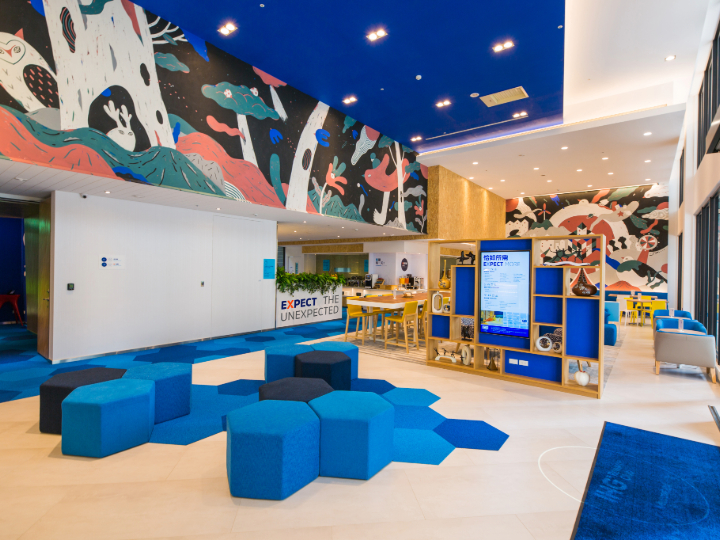 飯店選用穩重深藍與明亮黃色、溫暖橘色對話,大廳開放式公共區域「智空間」的彩色沙發、桌椅既活潑又舒適,煥發簡約時尚氣質,座位周邊設置了充足、便捷的充電插孔和USB介面,確保上網、電力連線不中斷,顧客辦公、商務活動、會議和休閒的需求一次滿足到位,靈活的設計適配工作與休閒性能兩便。