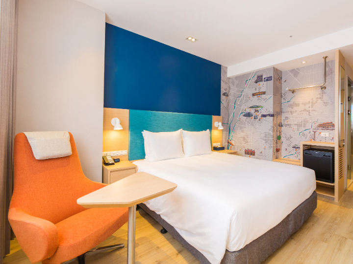 房間用色繽紛,側面牆上特製生動易懂的附近景點地圖壁紙,吃喝玩樂全看牆上,一目瞭然,是設計上的一大亮點,正如酒店自我要求持續朝向更高品質、更具效率的營運目標邁進,極力為住客串連在地資源,結合地方文化與特色體驗,享受美食、購物以及臺中國家歌劇院等娛樂節目,更可徜徉在中央公園的盎然綠意中。