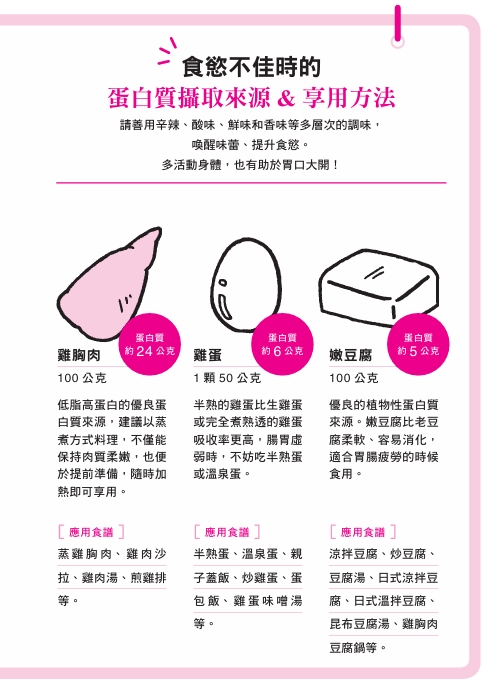 ▲食慾不佳時的蛋白質攝取來源和享用方法。(圖/新自然主義出版社提供)