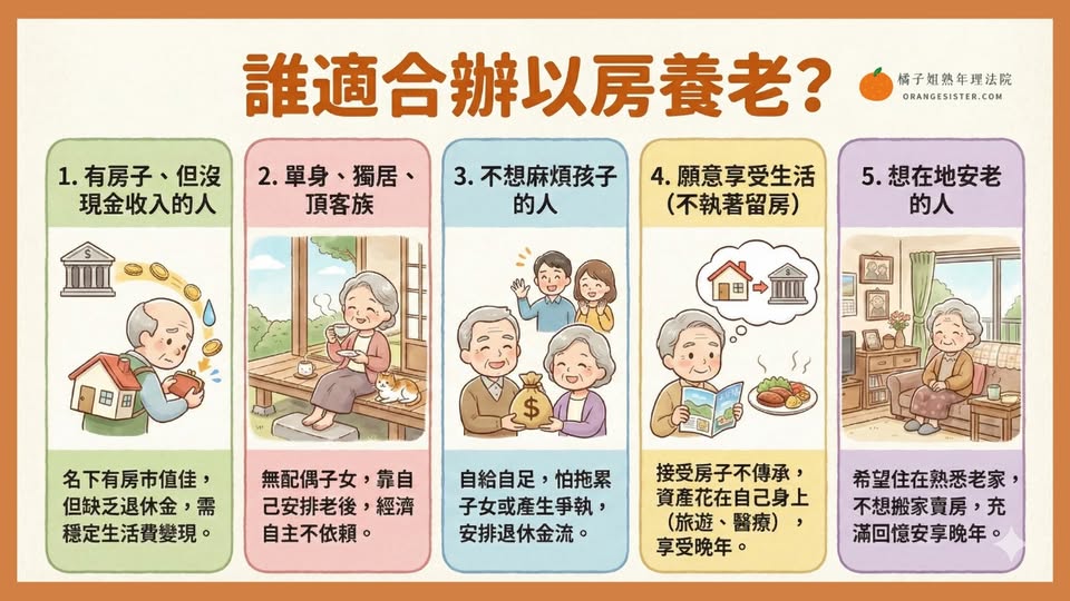 ● 適合誰? 手上有第二間房、或者打算搬去養老村(安養中心),把原本房子空出來的人。還有擔心被詐騙、不想讓孩子隨便揮霍財產的長輩。