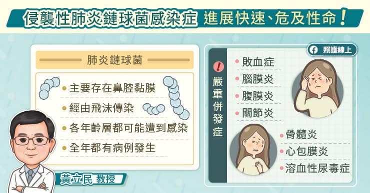 一旦感染,患者可能出現發燒、咳嗽、氣喘、胸痛、頭痛、頸部僵硬、嘔吐等症狀;而當帶菌者免疫功能下降,或同時感染呼吸道病毒性疾病時,肺炎鏈球菌更可能經由呼吸道或血液侵襲器官,引發中耳炎、菌血症、敗血症、肺炎及腦膜炎等疾病,甚至發展為侵襲性肺炎鏈球菌感染,包括關節炎、骨髓炎、心包膜炎、溶血性尿毒症、腹膜炎等重症。一旦病情惡化,不僅可能危及生命,也可能使原有的慢性疾病進一步失控。