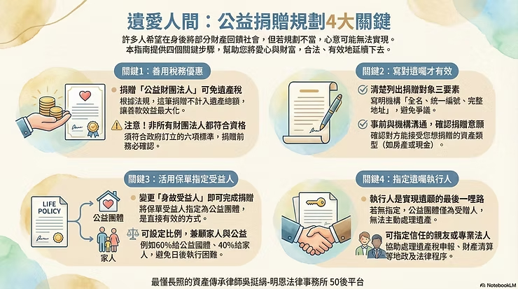 我都會協助客戶逐一確認,確保愛心不被誤用,也真正合法免稅。而該公益團體,未來將開立同意受遺贈的證明,供繼承人列報主管稽徵機關核發不計入遺產總額證明書,並請國稅局於證明書中註明捐贈金額。