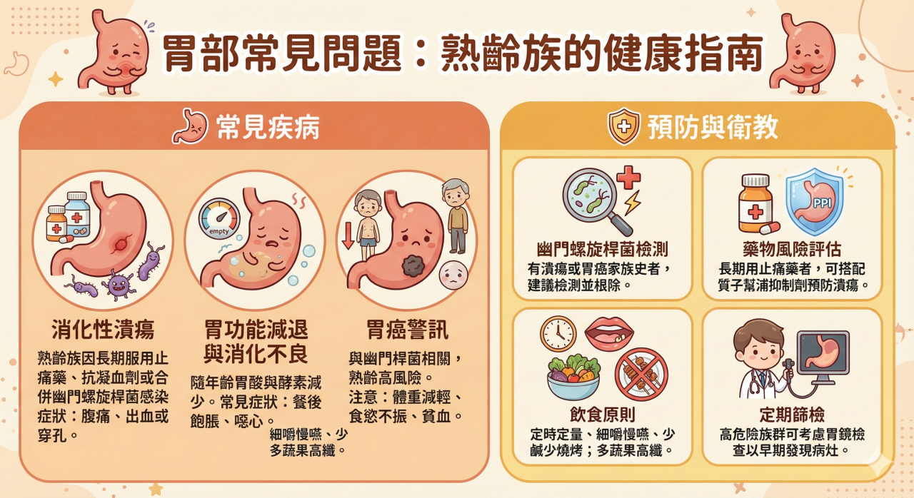 • 消化性潰瘍:熟齡族多因長期服用止痛藥、抗凝血劑或合併幽門螺旋桿菌感染。症狀可能腹痛或是不典型,甚至以出血或穿孔表現。
