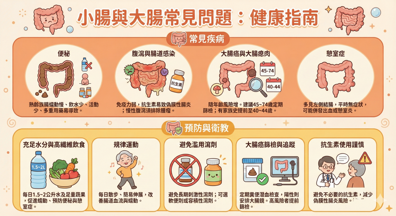 • 腹瀉與腸道感染:熟齡族免疫力較弱,使用廣效抗生素易導致偽膜性腸炎;慢性腹瀉也須排除大腸腫瘤或吸收不良。