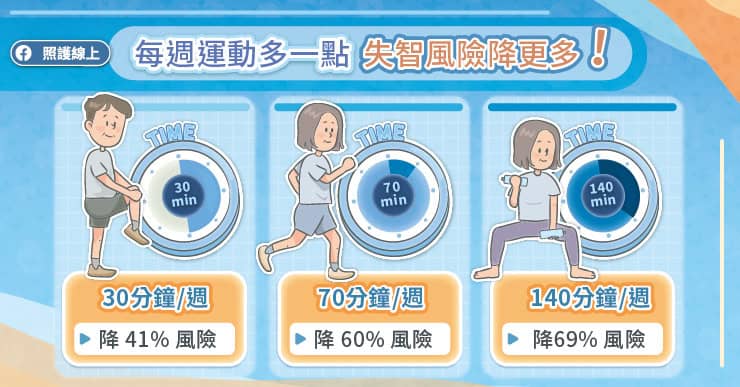 研究發現,每星期中度運動至劇烈運動的時間長短,與失智風險相關。
