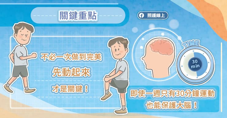 可是,這個研究告訴我們,即使一個星期只有做了總共30分鐘的中等程度運動,也能對降低失智風險有所幫助。所以我們可以用更自在的心情看待運動這件事。不需要抱著全有全無的心態,很多時候要動起來並不需要完整的運動訓練菜單,也不需要特定的地點。