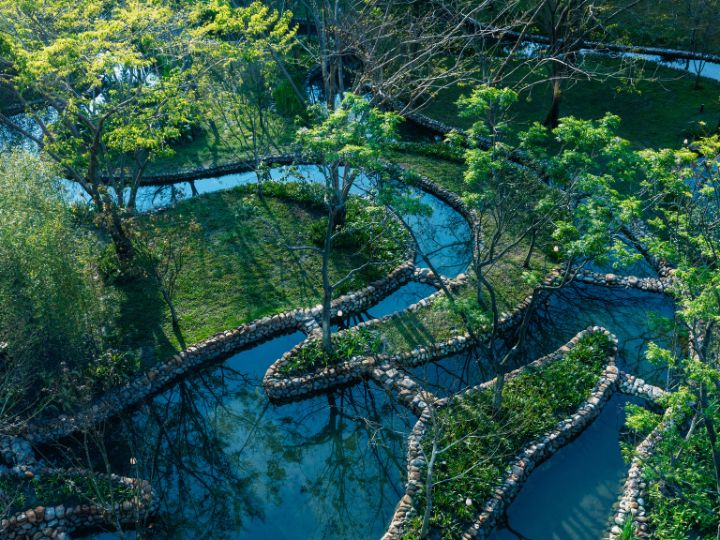 群山環繞之中,保留香杉、五葉松、二葉松等原生樹種,引流大甲溪水源,以平坦而開闊的設計,打造宛如山中庭園的流動景觀。「我們希望旅人一走進來,就能用身體理解這裡的節奏。」