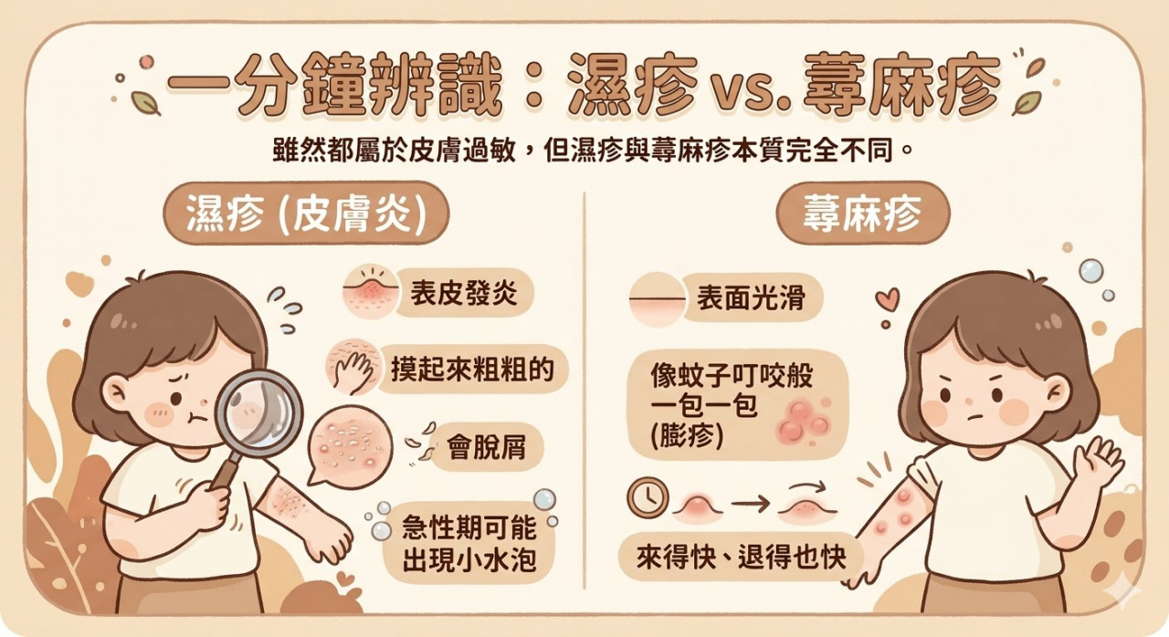 不過雖然濕疹與蕁麻疹雖皆屬「皮膚過敏」,但本質完全不同。