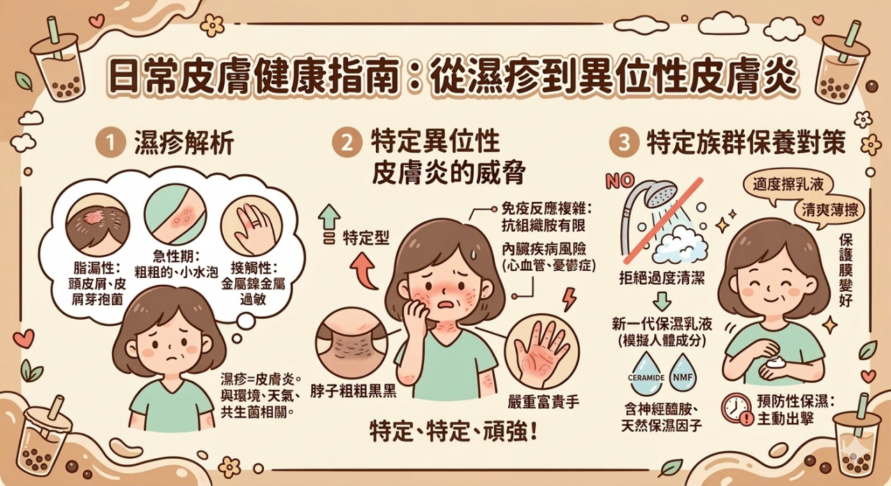 至於異位性皮膚炎,則屬於基因與免疫系統失調的慢性疾病,盛行率約1%至2%。患者常出現臉部泛紅、頸部粗黑、手部乾裂等症狀,且反覆發作、難以根治。朱家瑜提醒,異位性皮膚炎不只是皮膚問題,長期下來可能增加心血管疾病、代謝症候群,甚至憂鬱與焦慮的風險,與慢性發炎及長期睡眠受干擾有關。